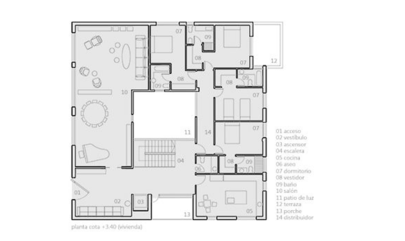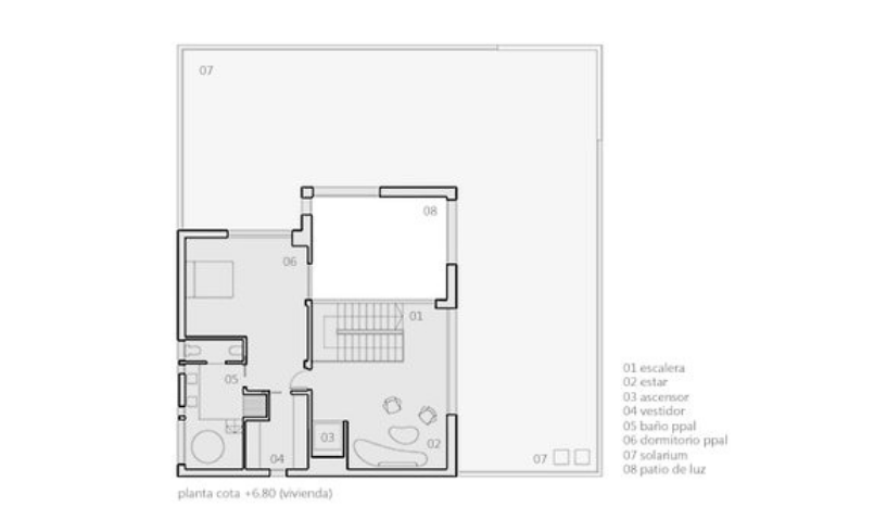 Una vivienda situada en las Rozas, en un entorno urbano y desarrollada en tres plantas con un patio central donde se encuentra el núcleo de comunicaciones. La última planta se plantea con una gran terraza ático en la que podemos disfrutar de las vistas de la parcela.