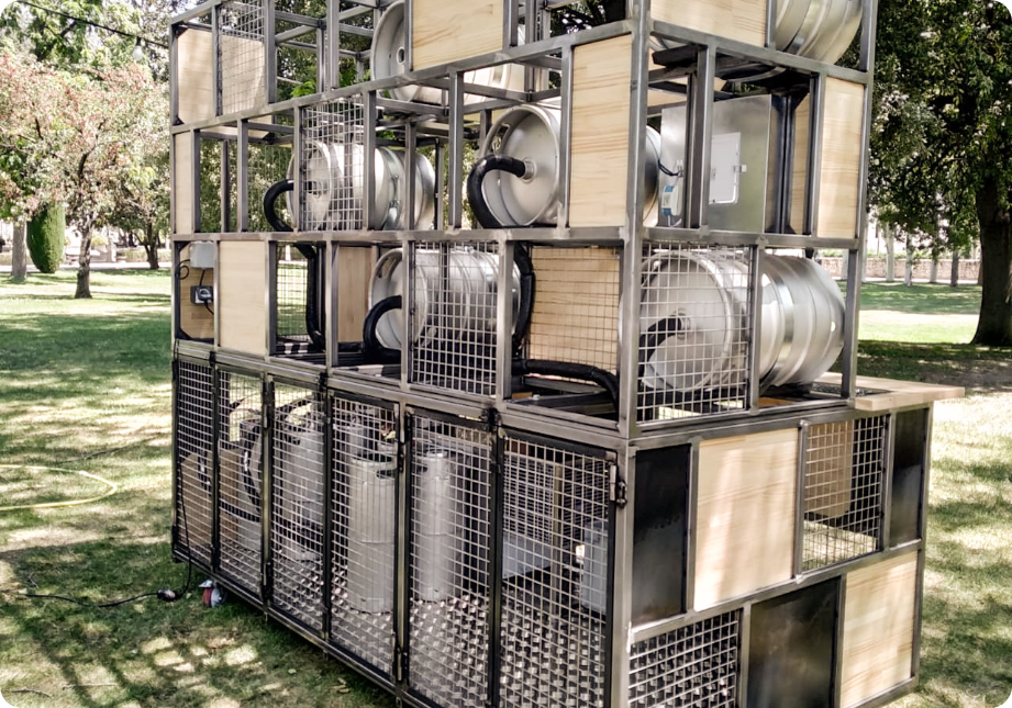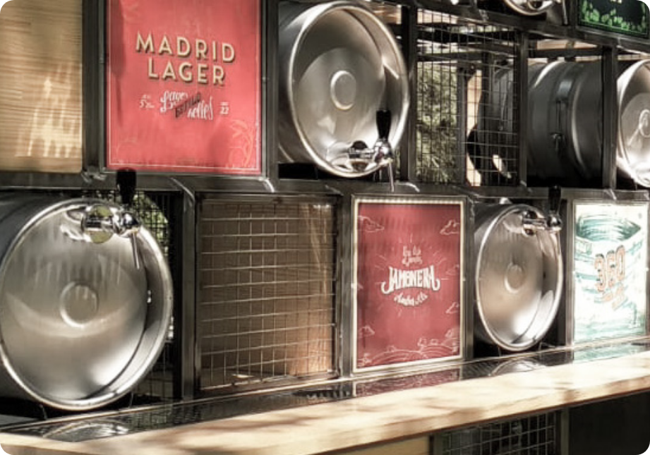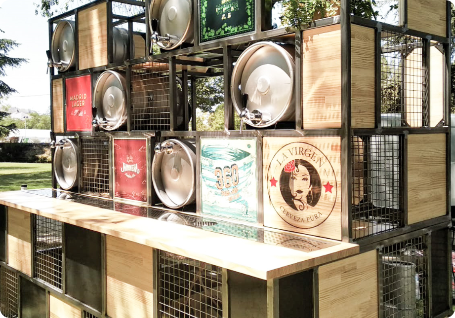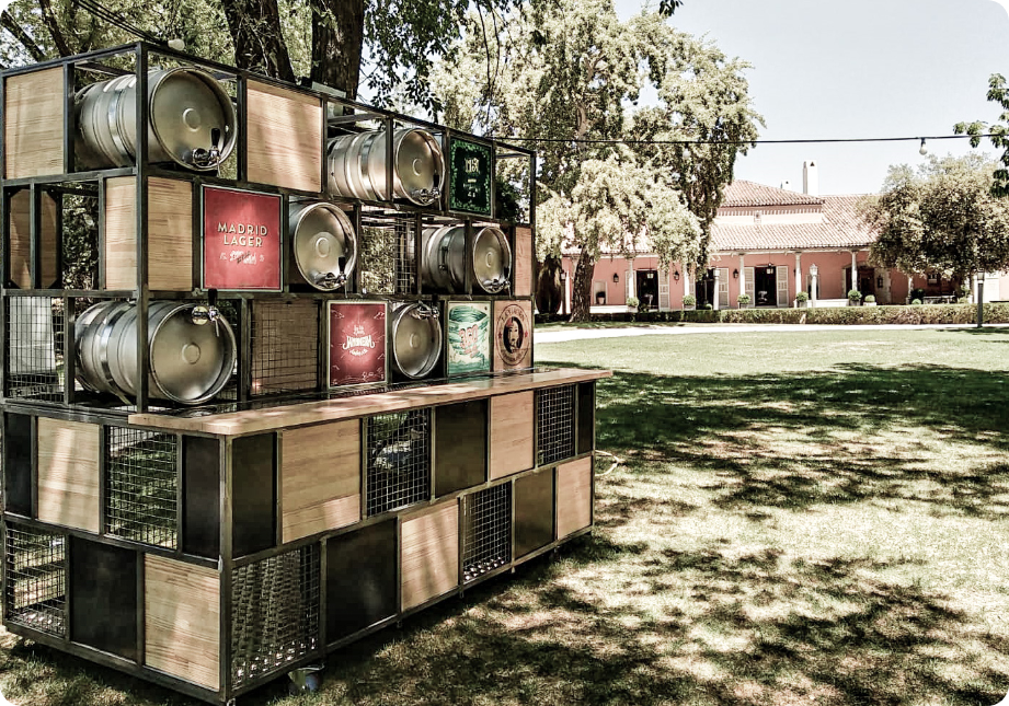 Nuestros clientes de cervezas la virgen, nos encargaron para una finca de boda un córner donde cupieran los barriles de las diferentes cervezas que tiene la marca sin perder el carácter esencial que tiene la compañía. Para ello mezclamos los tres conceptos que vemos en la marca, la industrialización, la versatilidad y la sencillez y lo hicimos mezclando varios materiales como el acero, la madera y la vegetación.